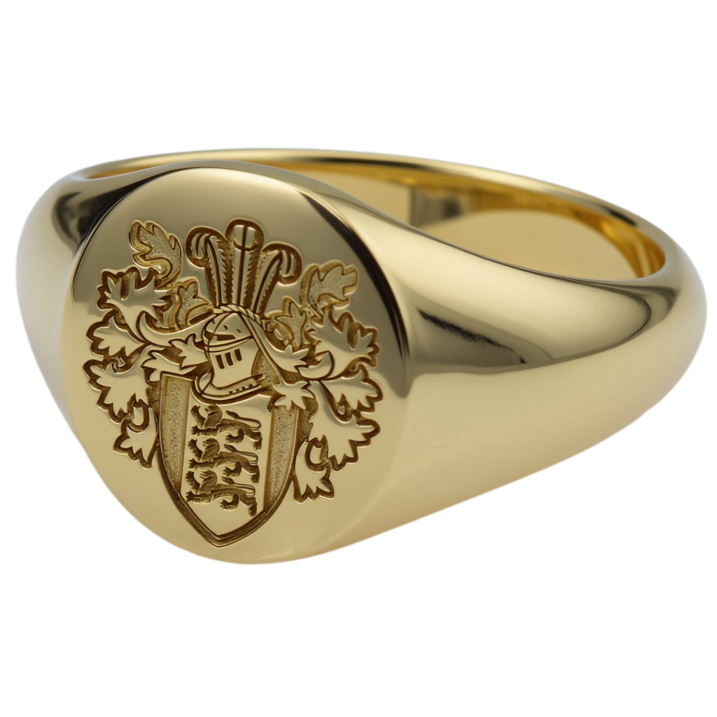 Your Crest, Perfectly Displayed: Your family crest, coat of arms, or unique insignia is expertly engraved in a classic, non-reversed format, making the design fully legible and 'for show' on the ring face.